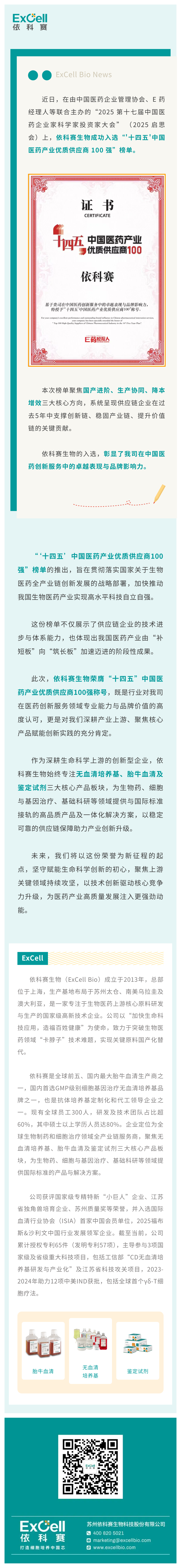 喜報|依科賽榮膺“十四五”中國醫(yī)藥產(chǎn)業(yè)優(yōu)質供應商100強稱號